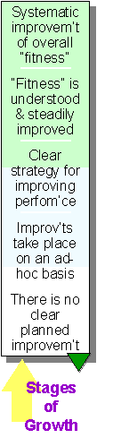 Systematic improvement of overall fitness: The fitness aspects which develop future team & process competence are now developed systematically as processes in their own right. The performance of these fitness processes are measured against clear targets and improved through re-design & a disciplined approach to problem solving. Fitness is understood and steadily improved: The team has fully grasped the concept that future performance is based on current practice in the fitness aspects which develop the team and process competence (e.g. management & training). They have begun to develop their performance in these areas. Clear strategy for improving performance: The team has now defined a long term strategy for developing its processes and performance, and improving it's service to the business and its customers. The strategy anticipates future needs & developments, & sets in place an improvement programme to meet it. Improvements take place on an ad-hoc basis: Firefighting has given way to prevention. Improvements now takes place in the absence of an immediate problem but they tend to reflect current local issues based on current practice. They are not seen as part of a coherent strategy for continuous improvement. There is no clear planned improvement: There is no specific plan for improving performance. Improvement only takes place where problems have reached a level which is unacceptable to the team or its customers. The focus is clearly on fire-fighting, with little in the way of follow up to prevent future fires.
